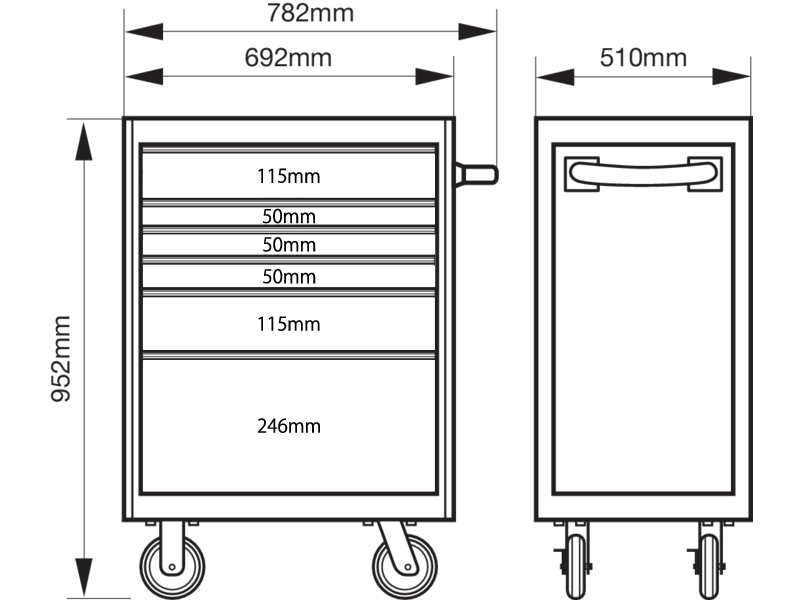 鍵は引き出しの横についている為、全面がスッキリして見え鍵をさしていても作業中の邪魔になりません。また、一番深い引き出しは、高さ約245mmありますのでインパクトレンチや大型電動工具なども収納できるのも魅力的です!